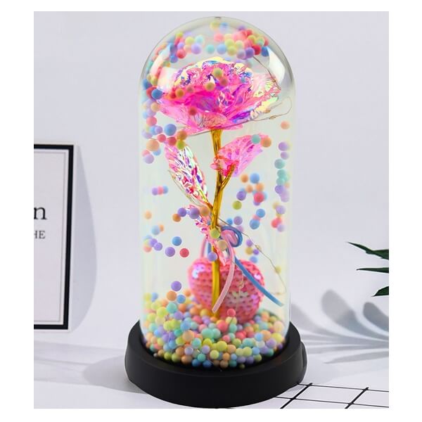 Roosa igavene kristallroos, mida kaunistavad süda ja värvilised helmed ning mis on asetatud elegantsesse LED-valgustusega kuplisse, on ainulaadne ja sümboolne kingitus. Õrn LED-valgus loob romantilise ja muinasjutulise meeleolu, muutes selle kauniks sisekujunduselemendiks igas ruumis.