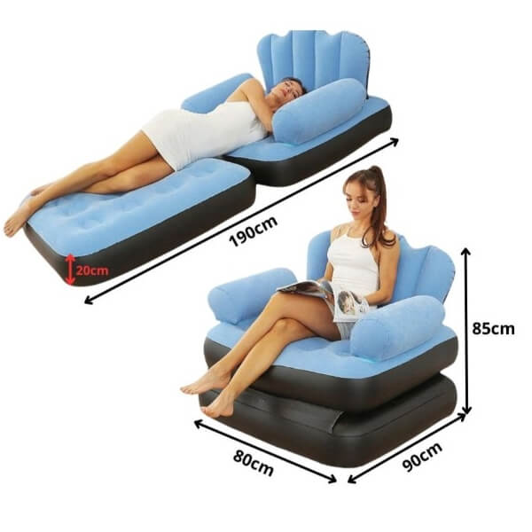 2in1 puhallettava sohva-nojatuoli / lepotuoli yhdistää mukavuuden ja monikäyttöisyyden – sitä voidaan käyttää klassisena nojatuolina selkänojalla ja käsinojilla tai muuttaa hetkessä makuuasentoon rentoutumista, lukemista tai päiväunia varten. Pehmeä nukattu pinta ja ilmalla täytettävä rakenne takaavat mukavuuden ja vakauden, kun taas kevyt paino ja mukana tuleva pumppu mahdollistavat helpon kuljettamisen kotona, parvekkeella, terassilla tai matkalla.