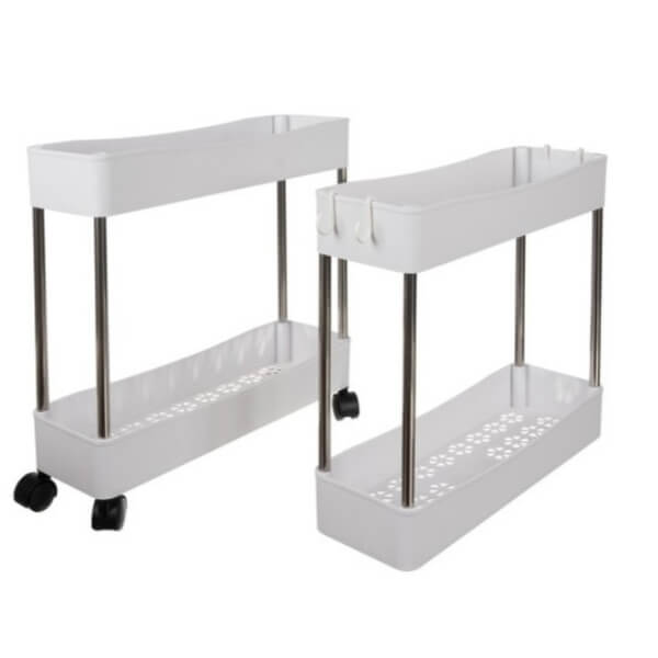 Komplektis on neli konksu, kuhu saab riputada rätikuid, käsnasid või muid tarvikuid. Tänu 360° pöörlevatele ratastele saab riiulit lihtsalt liigutada ka kitsastes ruumides – ei mingit tõstmist!