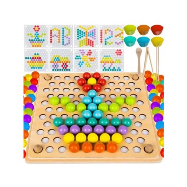 - Lõbus tegevus koos vanematega – mäng seisneb piltide kokkupanemises erinevat värvi helmeste ja pusletükkidega. Komplektis on ka näidispildid, mille järgi laps saab mustreid luua.