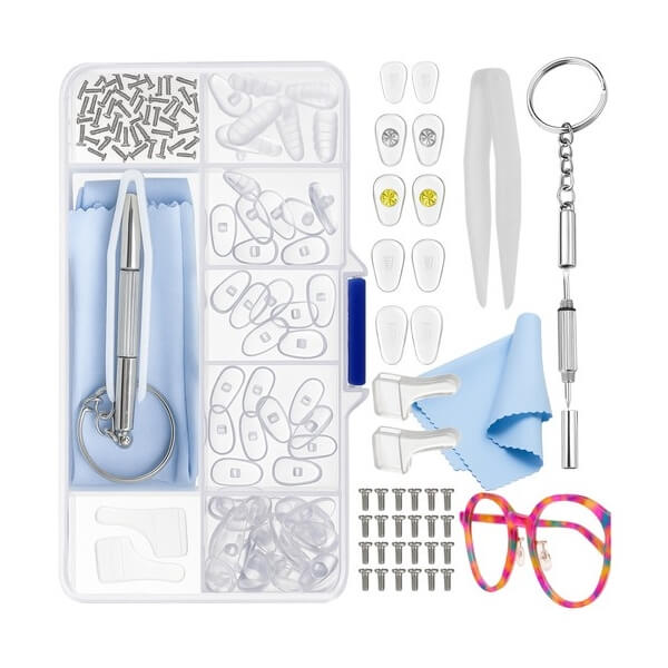 - Kõik vajalik ühes komplektis – komplekt sisaldab kõige sagedamini vajalikke elemente, et parandada enamiku prillide väiksemaid defekte, sealhulgas ninaotsad ja kruvid.