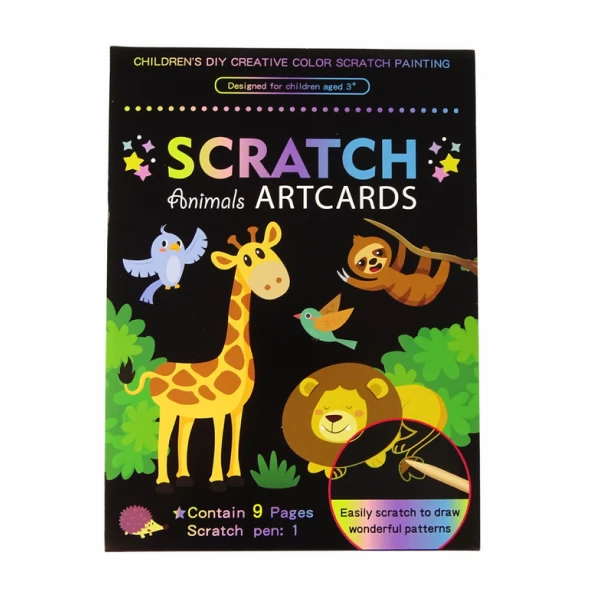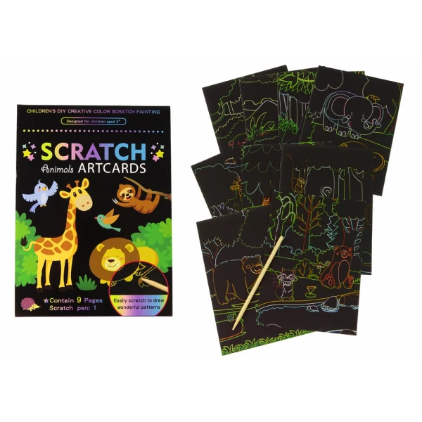Komplektis on 9 kraabitavat pilti, mille alt ilmuvad värviküllased ja rõõmsad illustratsioonid, kui laps eemaldab musta pealiskihi spetsiaalse puidust pulgaga.