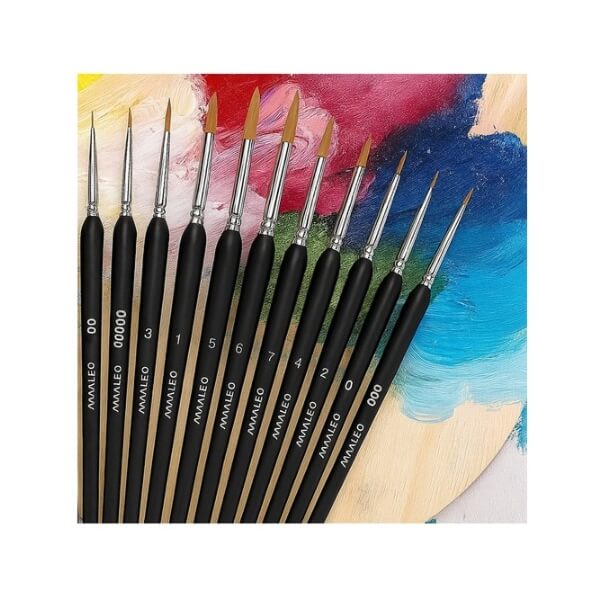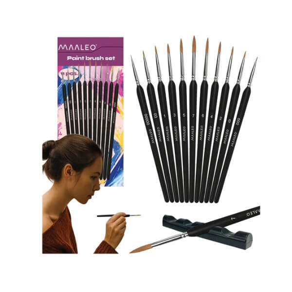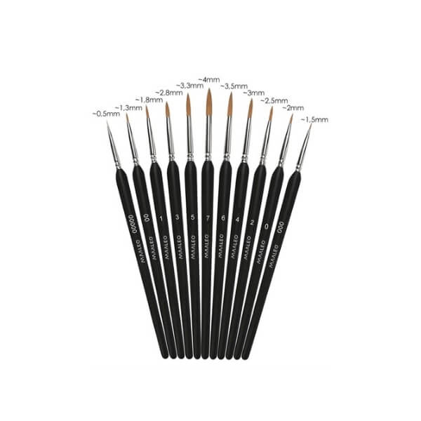 🖌️ Komplekt sisaldab 11 pintslit – suurustes 00000 kuni 7, mis võimaldab täpselt kontrollida detaile ja varjutada ka kõige väiksemaid elemente.