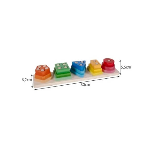 Sorter sisaldab 5 kujundit: ring, kolmnurk, ruut, ristkülik ja viisnurk. Laps õpib põhilisi kujundeid mängides loomulikul viisil.