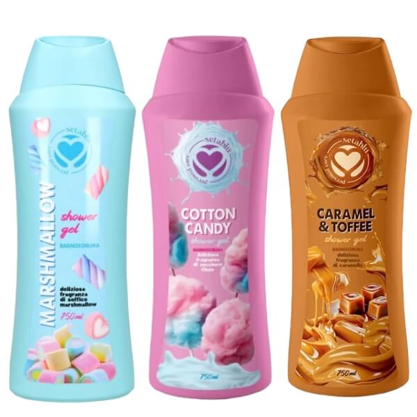 Komplektis on kolm suurt 750 ml dušigeeli – vahukommi, suhkruvati ja karamelli & toffee lõhnaga.