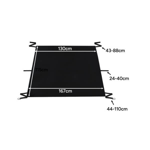Mõõdud 130 × 115 × 167 cm, reguleeritavad kinnitusrihmad sobivad enamikule sõiduautodele.