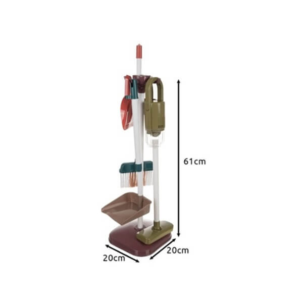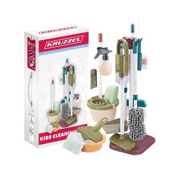 🪣 Terve majapidamisarsenal ühes – komplektis on 15 erinevat elementi, sh mop, ämber, hari, kühvel, käsn, tolmuimeja ja palju muud. Kõik vajalik lõbusaks koristusmänguks!